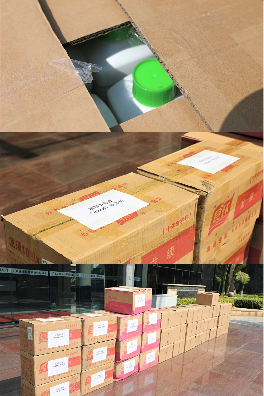 本次捐贈的物資包含960瓶的100ml酒精消毒液、500瓶的1升次氯酸消毒液(巴氏消毒液)以及200件防護雨衣。